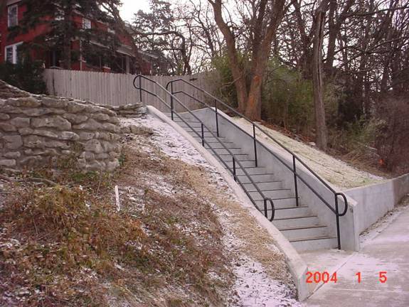 The ONA (Oread Neighborhood Association) 12th and Mississippi Stairs Project (see below) was initially funded with CDBG funds for $4,100 in 2000. Funds were used for a topography study and initial design for the project. Interested neighborhood residents were involved with design concepts for the stairs. CDBG funds totaling $62,000 were allocated in 2001 and 2002 for the final Design and Engineering of the project, as well as subsequent construction of the new stairs. After construction was completed late last fall, approximately $3,000 remained of the allocation. NR staff is currently working with ONA residents and P & R staff to determine appropriate low-maintenance landscaping for the area. The $3,000 balance of CDBG funds will be used to purchase the plantings, which will be installed by P & R staff. Adjacent neighbors have assumed the responsibility for planting and watering flowers and are agreeable to continuing this plan.