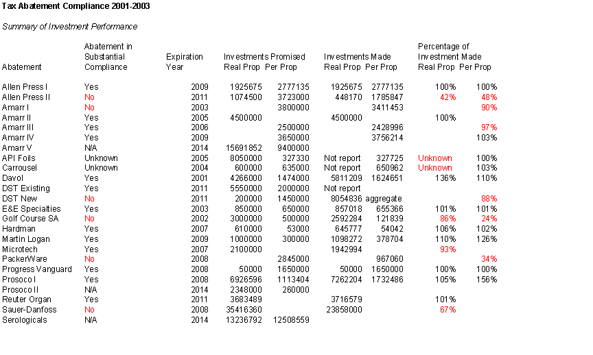 Table 1 indicates whether or not each abatement generated the promised investments in real property and in personal property. An abatement is deemed to be in substantial compliance if more than 90 percent of the promised investment was made. Note that the level of investment is not known for some early and now expired abatements.