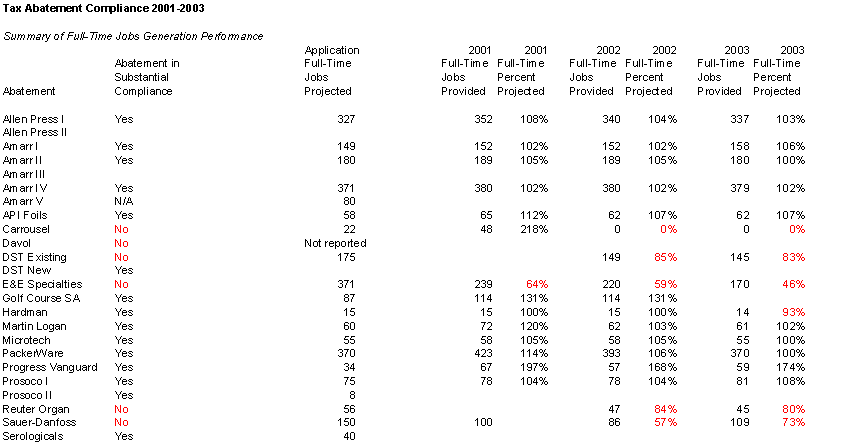 This table indicates that 6 of 20 abatements did not generate the promised full-time jobs in 2003, up from pervious years.