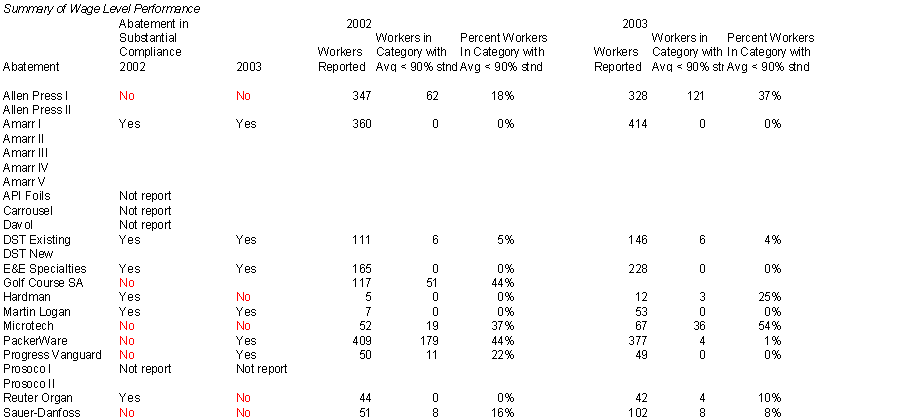 The table indicates that 6 of 12 reporting abatements were not in substantial compliance in 2002. It also indicates that 5 of 12 reporting abatements were not in substantial compliance in 2003. Additional firms are out of business and, as such, are not paying the promised wages.