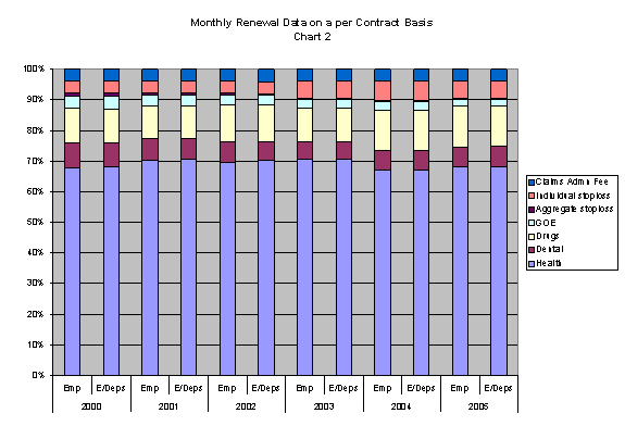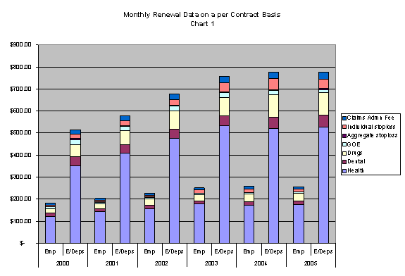 Claims administration costs are charged as a percent of claims, which means a 1.54% increase in claims administration for 2005. This is accompanied by a 31.21% decrease in general operating expenses and a 9.40% decrease in the aggregate and individual stop loss coverage (i.e. reinsurance).