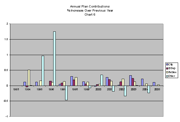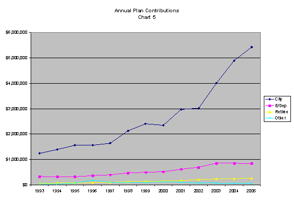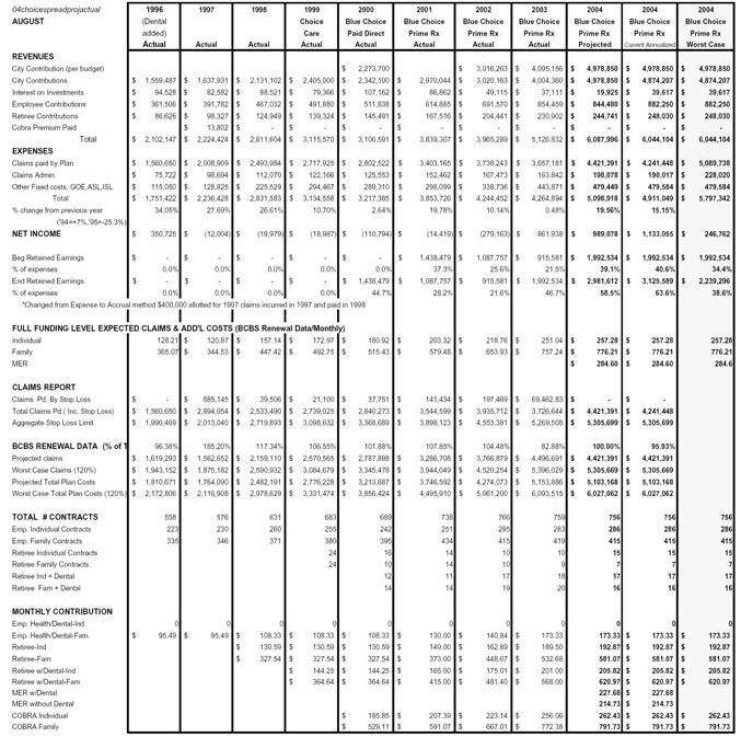 As noted from the table above, because of our low claims experience in 2003, and assuming we end this year and next year as expected, the City’s retained earnings level will be very healthy at the end of this year and will grow even higher at the end of 2005. If those assumptions hold true, it will afford us the opportunity to study and establish a maximum funding matrix for retained earnings with the express purpose of smoothing out the peaks and valleys that create budget difficulties for the City and employees alike. Our current funding practice has yielded wide fluctuations in total funding (city, employees, retirees and COBRA) ranging from a decrease of -0.18 in 2000 to an increase of 29.48% in 2002. (1997 5.82%, 1998 26.74%, 1999 10.86%, 2000 -0.18%, 2001 23.42%, 2002 3.4%, 2003 29.48% and projected 2004 -.084%). One of the 2005 HCC activities will be to study the long term needs of the health care plan to establish a recommended maximum level for retained earning to accompany the minimum funding level which we currently use.