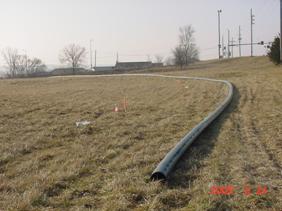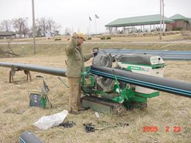 Fusing the HDPE pipe segments together HDPE pipe train in field (555’)