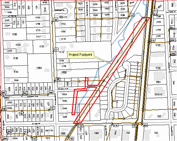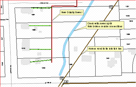 The goal of this project was to alleviate sewage spills in Burroughs Creek that resulted from broken private sanitary sewer service lines that crossed the creek. Four properties on the east side of Learnard, north of 19th Street were served by a public sewer some distance away, on the other side of Burroughs Creek. A new sewer line was designed so the properties could connect without crossing the creek (see Map 2). Closed circuit television inspection (CCTV) also revealed that the 12” line on the east side of Burroughs Creek was cracked, broken and undersized, so a new 18” sewer (1,423’) was installed to replace the pipe as part of this project.