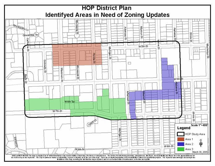 At the May 10th City Commission meeting, the HOP District Plan was approved by the Commission and staff was directed to work with the neighborhoods to implement the recommendation of the plan. The Commission also directed staff to draft a temporary building moratorium ordinance for the three areas identified in the plan that need further study related to incompatibilities of existing land uses and zonings. Staff has met with each of the three neighborhood representatives about the areas identified for further study. Two neighborhood representatives indicated a desire to proceed at this time with forming ad hoc committees to study the incompatibilities issue. The Legal Services Department has drafted a temporary building moratorium for the two neighborhood areas that are ready to proceed at this time. These areas are within the boundaries of Hillcrest (Area 3) and Old West Lawrence (Area 2) Neighborhood Associations. [See attached map] The Pinckney Neighborhood Association would like to proceed with the study of the area in their neighborhood association (Area 1) after the Development Code has been adopted as it provides greater option for zoning categories to address the identified incompatibility needs.