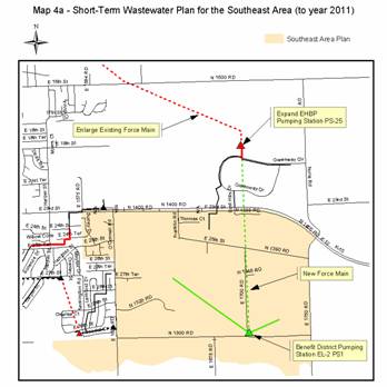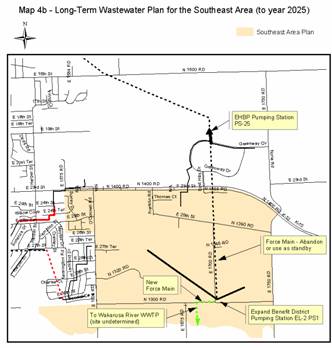 Horizon 2020 identifies that urbanization of Service Area 4 should occur only after a municipal wastewater treatment system (to serve the area) is either planned or under development. The recently approved update to the City’s Wastewater Master Plan for the City of Lawrence indicates that sanitary sewer can be provided to the study area. How service will be provided is based on a more in-depth study that recommends that sewer lines for the effluent from the study area be designed for ultimate treatment at the proposed Wakarusa River WWTP when the plant becomes operational.