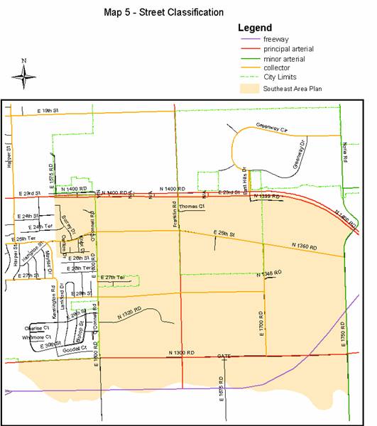 Currently, the only roads in the study area that are constructed to city standards are Franklin Road, Franklin Park Circle and a portion of E. 25th Street. O’Connell Road (E1600 Rd) is considered a “boundary line road” because of its location coincident with the city limits. Reconstruction of O’Connell Road (E1600 Rd) is currently under way as part of a joint City/KDOT project. The major street element of the Southeast Area Plan is the arterial and collector street network.