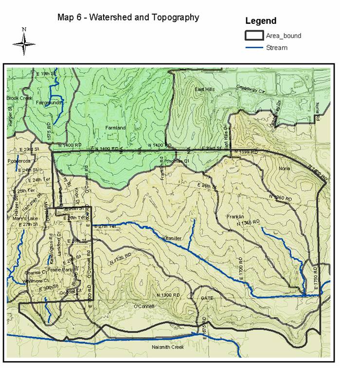 The study area is in the East Lawrence (EL-2) drainage basin, which is south of the Kansas River (KR-6) drainage basin. The east-west ridge line that separates the two drainage basins generally runs along K-10. The basin north of K-10 (KR-6) drains to the north toward the Kansas River valley. The basin south of K-10 (EL-2) drains to the south toward the Wakarusa River valley. There is no Federal Emergency Management Agency (FEMA) designated floodplain located within the study area. The southern boundary of the study area is the Wakarusa River floodplain as designated by FEMA.