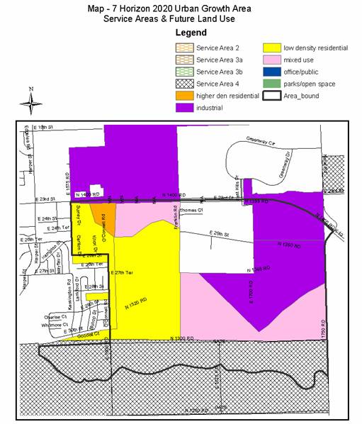 Horizon 2020 identifies the study area as being within the City of Lawrence Urban Growth Area (UGA). A majority of the study area is identified as being located within Service Area 1. Designated land uses were applied to all areas within Service Area 1 as shown on Map 3-1 “Lawrence Urban Growth Area Service Areas and Future Land Use” found in Horizon 2020. Service Area 1 is generally considered to be the area that will urbanize first as urban services are readily available or extendable to it. A small portion of the study area is located within Service Area 4 and makes up that area south of 31st street extended otherwise know as N. 1300 Road.