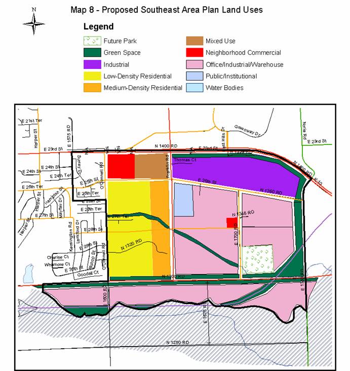 · The existing location land for a future park is not centrally located within the study area. This plan recommends that a more centrally located park/school site complex would better serve the residential neighborhood area. Based on this premise, a recommendation in this Plan is that the City investigates the possibilities of alternative uses for the future park for this area. This can be accomplished by a land swap or sale of the existing site and purchase of a new, more central location. Green Space areas are proposed as a buffer use between the residential areas, E. 31st Street and the South Lawrence Trafficway. Open space is specifically proposed along E. 23rd Street as a gateway. Horizon 2020 identifies 23rd Street/Hwy. K-10 from the east as a designated gateway. Goals and Polices found in the comprehensive plan with regard to gateway treatments are applicable within the study area and are found in Horizon 2020 in the Commercial and Industrial chapters.