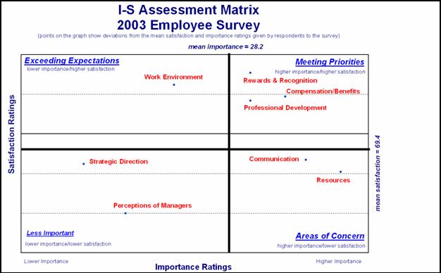 · Areas of Concern (above average importance and below average satisfaction). This area shows where the organization is not performing as well as employees expect the organization to perform.