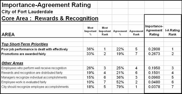Importance-Agreement (I-A) Rating. In addition to the matrix analysis, ETC Institute has developed an Importance-Agreement Rating (Agreement with statements is used in lieu of Satisfaction). This I-A rating allows organizations to quantitatively assess the relative importance that should be placed on areas for organizational improvement. The methodology for calculating the Importance-Agreement Rating will be provided if ETC Institute is selected for this study. A sample of the rating that was developed by ETC Institute for the City of Fort Lauderdale, Florida (an organization of 2400 employees) is provided below.