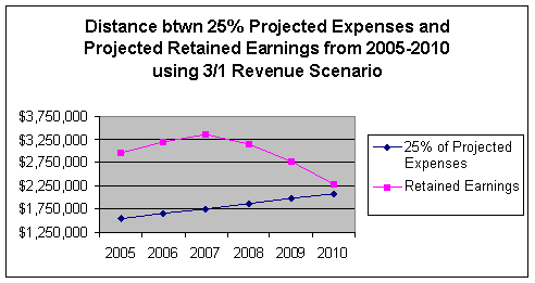3. Our funding recommendations are based on a strategy designed to allow predictable incremental increases in funding over a limited number of consecutive plan years. Our funding recommendations are based on the work of KU Assistant Professor Justin Marlowe and Management Intern Regan Gerlt who ran several funding scenarios after collecting incurred claims data over the last ten years to then project our plan costs. Assistant Professor Marlowe simulated the probability that the various revenue funding scenarios presented would meet the health care committee’s stated objective of 25% of projected costs as a benchmark for retained earnings. His risk software provided a normal distribution of all of the possible values that health care expenses and revenues could assume. The projected expenses provided were in the 95th percentile of overall projected costs (meaning that there is less than 5% chance that expenses for each given year will exceed the figures given). The projected revenues provided were in the 5th percentile of their normal distribution (meaning that there is less than a 5% chance that revenues for each given year will fall below the figures given). These numbers represent a conservative budgeting ideology. Given the above, Marlowe and Gerlt recommended that the 3&1 revenue funding scenario be adopted by the health care committee (see graph below). The 3&1 revenue scenario calls for the City to contribute 3% and employees 1% for 4 consecutive years from 2006-2010. This strategy requires diligent monitoring as claims continue to be incurred and adjustments may be necessary. To do so it will be necessary to purchase the risk software and retain the consulting services of Justin Marlowe (separate line items under the Administrative Services Personnel budget request).