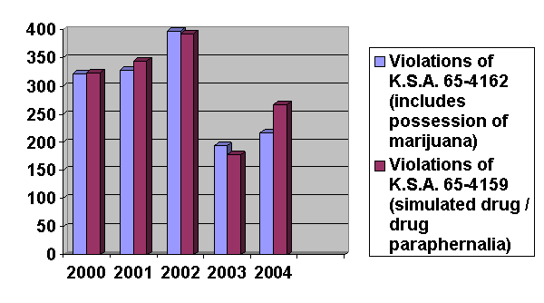 A subject of obvious interest is how many cases the proposed ordinance would add to the municipal court’s caseload.  An exact number is difficult to predict, but it is possible to estimate an upper limit based upon the number of past standard offense reports alleging violations of K.S.A. 65-4162, the marijuana possession statute, and K.S.A. 65-4159, the drug paraphernalia and simulated controlled substances statute.  The following chart shows the number of police reports alleging violations of these statutes between the years 2000 and 2004.