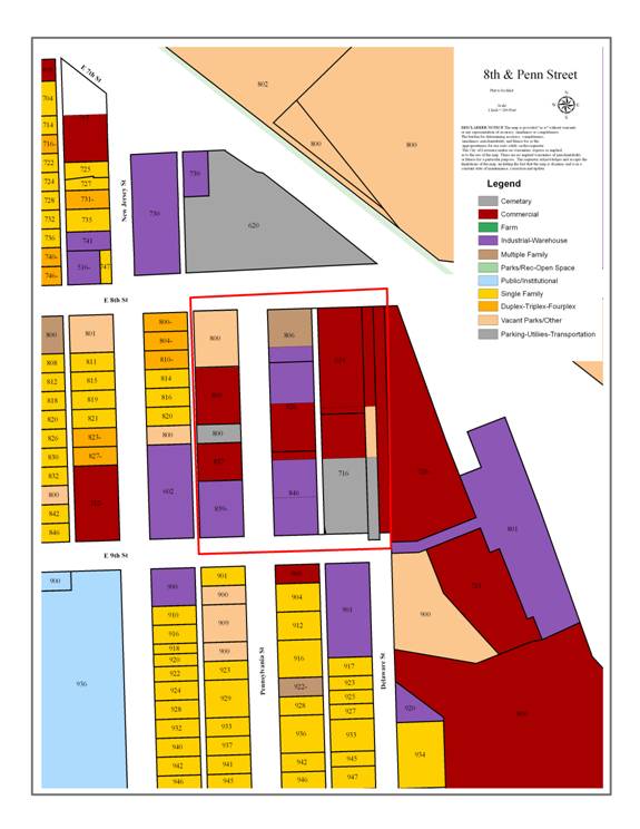 Commencing on 8th Street at the extended centerline of the alley between New Jersey Street and Pennsylvania Street; thence south along the centerline of said alley to the centerline of the 9th Street right-of-way; thence east along the centerline of 9th Street right-of-way to the east line of the Delaware Street right-of-way, which is also the west line of Lot 1, McDonald Beverage Addition; thence north along the east line of Delaware Street right-of-way to the center line of 8th Street, thence west along the center line of 8th Street to the point of beginning.