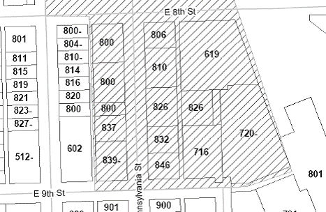 Commencing on 8th Street at the extended centerline of the alley between New Jersey Street and Pennsylvania Street; thence south along the centerline of said alley to the centerline of the 9th Street right-of-way; thence east along the centerline of 9th Street right-of-way to the east line of the Delaware Street right-of-way, which is also the west line of Lot 1, McDonald Beverage Addition; thence north along the east line of Delaware Street right-of-way to the center line of 8th Street, thence west along the center line of 8th Street to the point of beginning.