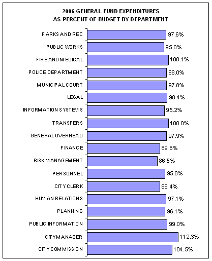 · General Fund expenditures overall were 98.1 % of budget. This is higher than expenditures in 2005 which were closer to 97% of budget. The trend should be monitored as it will impact future budgets.
