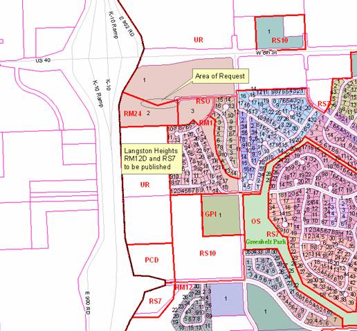 The original boundary of the zoning district was established prior to the finalization of development plans for the area. Langston Heights Final Plat included RM12D and RS7 south of the subject property that showed the extension of Ken Ridge Drive to the south parallel to K-10 Highway. It was noted at this time that adjustments would be probable for a small area so that the zoning boundary and the amended lot lines would align.