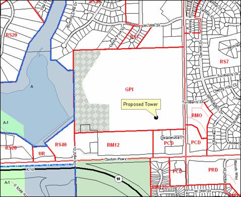 South of the subject property is a Planned Commercial Development [Wakarusa Center] PD, which contains a nursery and garden store, a mini-storage facility, and a car wash. A multi-family development which is zoned RM12 (Multi-dwelling Residential) District is also located to the south of the subject property. The proposed use is located on the southern side of the subject property housing the Clinton Water Treatment facility and City Fire Station #4.