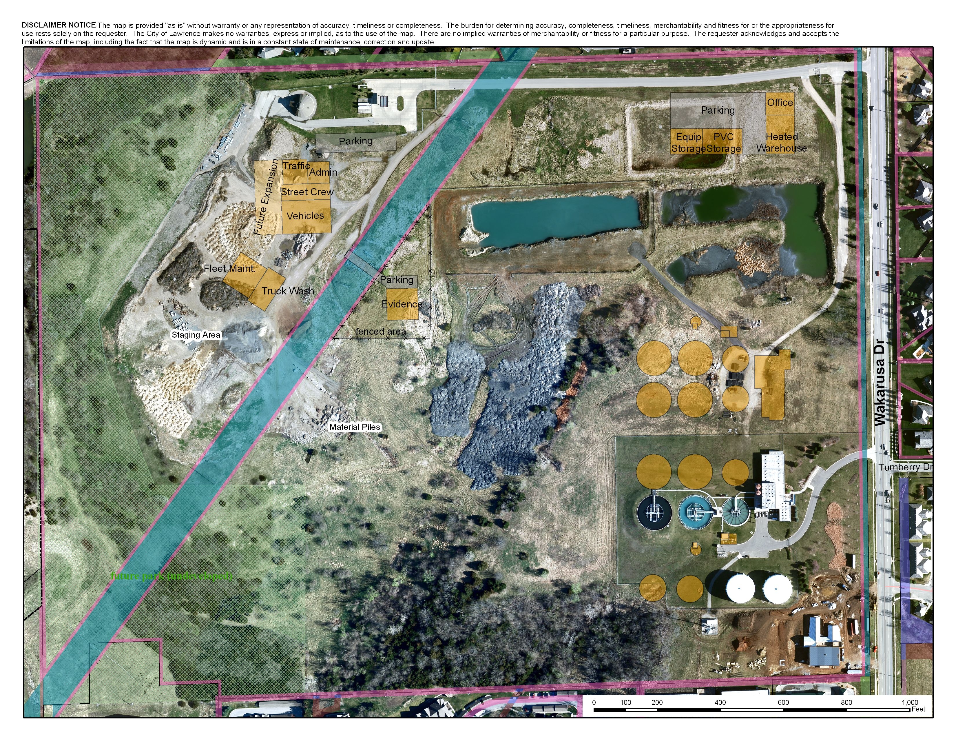 Recommendation: The aforementioned Public Works facilities are in residential areas, thus access to the facilities is through those neighborhoods by City vehicles. As the community continues to expand, improved access to major arterial streets will allow improved response by City crews to the entire community. A plan to locate multiple operations at a Wakarusa Service Center, just west of the Clinton Water Treatment Plant off of Wakarusa Drive, would allow for improved access (efficiency of operations) and additional work space to allow City staff to continue to provide excellent services to the community. The plan involves the following approach, which could be accomplished in phases, as funding is available: