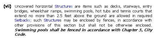 OVERVIEW OF REVISIONS PROPOSED Revised language has been drafted for three individual amendments and is presented in the Staff Report. Sections 601(a), the Residential District Density and Dimensional Standards Table, and Sections 601(b), the Nonresidential District Density and Dimensional Standards Table have been amended as shown. The specific amendments to these tables are discussed in greater detail below. Additionally, revised language is provided for Section 602(e)(6)(vii). · Section 20-601(a): The revised language proposes amending Footnote [4] below the table. The current language states that Maximum Building Coverage and Maximum Impervious Coverage standards apply only to lots platted after July 1, 2006. However, these standards should apply to any improvement to a property which increases the building coverage or impervious coverage. The previous zoning code did not have Maximum Building Coverage or Maximum Impervious Coverage standards. If these standards apply only to newly platted lots, they will not apply to many redevelopment projects. These standards were created in response to gaps in the previous regulations which often allowed property owners to pave substantial portions of residential lots. · Section 20-601(b): The revised language proposes amending every cell in this table which contains Footnote [5]. This footnote states that the standards contained in each cell apply only to lots platted after July 1, 2006. The problem with this is that it does not provide the reader with the applicable density or dimensional standard for a property platted before July 1, 2006. For instance, what is the front yard setback of a CS-zoned property platted prior to July 1, 2006? This is an error in the table and must be corrected. To correct this, Staff proposes inserting the density and dimensional standards from the previous zoning code to provide standards for all properties as they currently exist and for proposed development, regardless of when platted. Staff chose to use standards from the previous zoning code in order to prevent numerous non-conformities as a result. Footnote [5] will remain applicable to the Minimum Lot Width for CS-zoned properties because if a property is replatted in the CS District the increased lot width is desired. These changes specifically resolve the issues for all of the standards contained within this table with the exception of Maximum Lot Coverage, Maximum Impervious Lot Coverage, and Minimum Outdoor Area per dwelling unit. Because these standards are new standards in the Development Code, it makes sense that they would only apply to lots platted after July 1, 2006, however a property may redevelop without replatting, which creates a loophole from these standards for new development on an existing platted lot. Therefore, Staff proposes adding Footnote [11] which states “Applies to any Significant Development Project” so that any new development which meets the definition of Significant Development Project is required to comply with these standards. · Section 20-602(e)(6)(vii): The revised language for this section will provide clarity and consistency between these regulations and those of the new residential building code. That code requires fencing around swimming pools for security purposes. Staff believes this section should state this requirement as well. · All Other Amendments Identified are those initiated by the Planning Commission previously. They are included in the staff report to provide the status of ongoing staff review of each amendment and for tracking purposes only. |