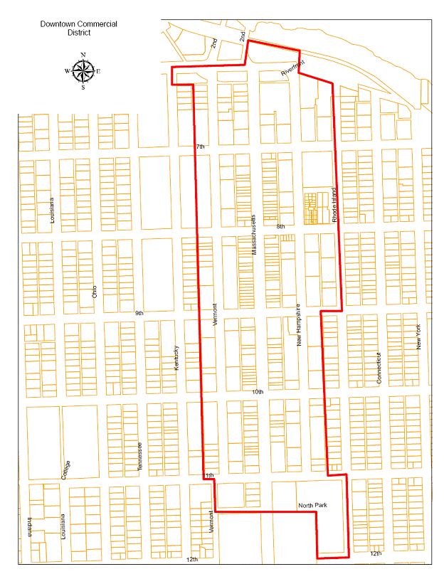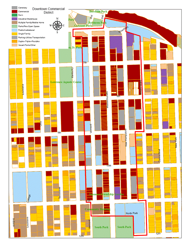 Levee Lots 1- 15; Lots 1-116 on Vermont Street; Park Street Lots 17-29 (odd), less right-of-way for alley; Lots 1-19 (odd) on Massachusetts Street and all the vacated alley right-of-way adjacent to Lots 13-17 (odd); Lots 21-41 (odd) on Massachusetts Street; Lots 1 & 2, The Palace Addition; Lots 45-115 (odd) on Massachusetts Street; Lots 2-20 (even) on Massachusetts Street; all the vacated alley right-of-way adjacent to Lots 2-10 on Massachusetts Street; Lots 22-116 (even) on Massachusetts Street; all the vacated alley right-of-way adjacent to Lots 70-76 on Massachusetts Street; Park Street Lots 1-15 (odd) and the vacated North Park Street right-of-way adjacent to said lots; Lots 117-139 (odd) on Rhode Island Street and the vacated New Hampshire Street right-of-way adjacent to said lots; Lots 1-115 (odd) on New Hampshire Street; Levee Lots 16 - 20; Lots 6, 8 & N ½ of Lot 10 on New Hampshire Street and all the vacated alley right-of-way adjacent to said lots; the S ½ of Lot 10 and Lots 12-20 (even) on New Hampshire Street; Lots 1 & 2, The Winter Block Addition; Lots 46-116 (even) on New Hampshire Street; Lots 7-19 (odd) on Rhode Island Street; Lots 45-67 (odd) on Rhode Island Street; all lots being in the Original Townsite of the City of Lawrence, Douglas County, Kansas. Also, an unplatted tract bounded on the north by the BNSF Railroad right-of-way, on the south by the Sixth Street right-of-way, on the east by New Hampshire Street (extended) right-of-way, and on the west by Massachusetts Street right-of-way.