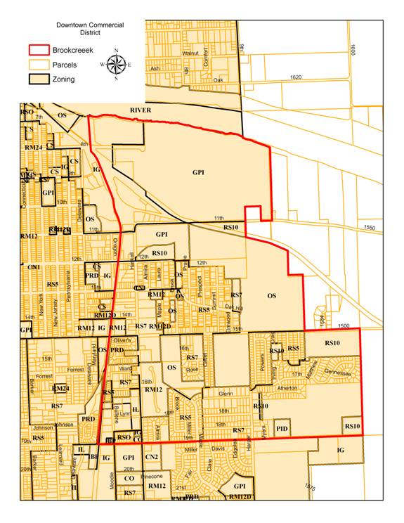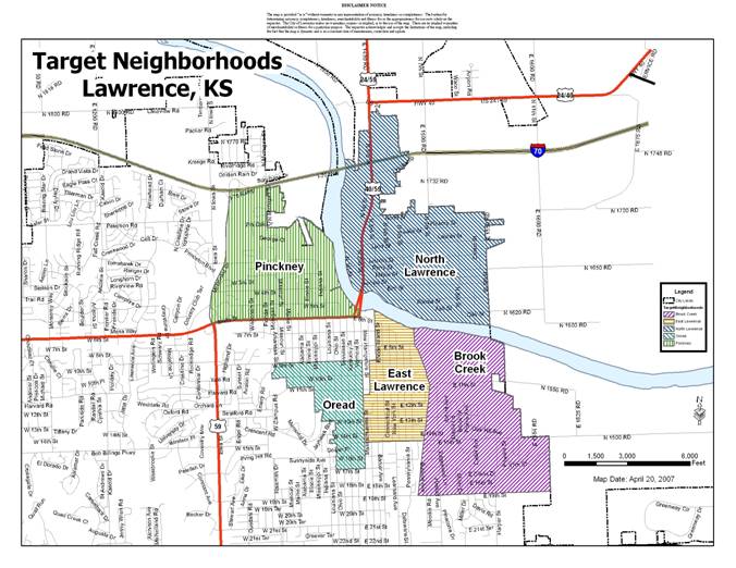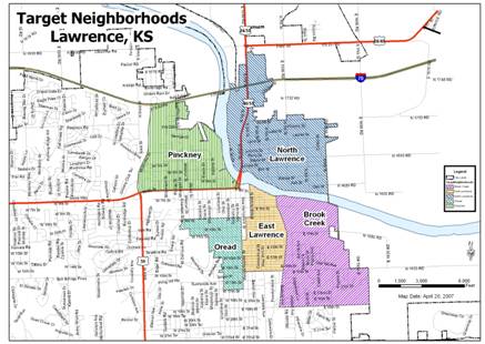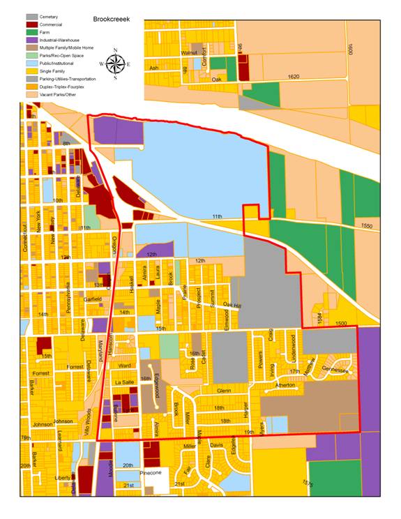Brook Creek Neighborhood: That area of the City of Lawrence, Douglas County, Kansas, bounded on the east by the City Limits; on the north by the Kansas River; on the west by the Santa Fe Spur Line; and on the south by the north side of 19th Street to the City Limits, excluding Edgewood Homes.