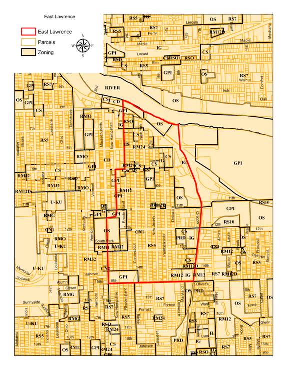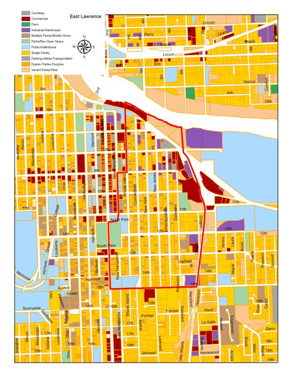 East Lawrence Neighborhood: That area of the City of Lawrence, Douglas County, Kansas, bounded on the North by the Kansas River; on the south by 15th Street and on the East by the Santa Fe Spur Line. The western boundaries are as follows: Rhode Island Street between the Kansas River and 9th Street; the alley behind New Hampshire Street between 9th and 11th Streets; Rhode Island Street between 11th and South Park Streets; and Massachusetts between South Park Street and 15th Street.