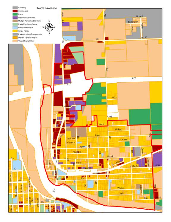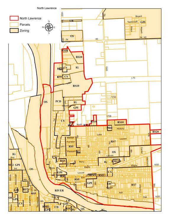 North Lawrence Neighborhood: That area of the City of Lawrence, Douglas County, Kansas, bounded on the north and east by the City Limits; on the south and west by the Kansas River.