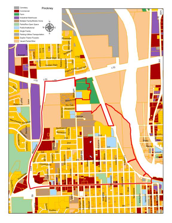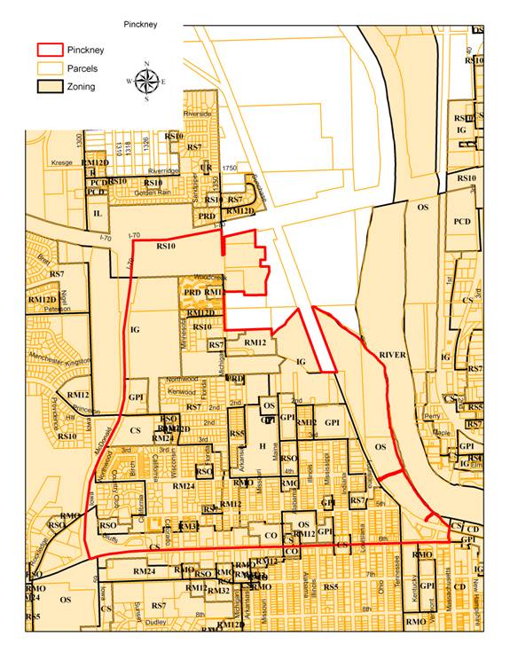 Pinckney Neighborhood: That area of the City of Lawrence, Douglas County, Kansas, bounded on the south by 6th Street; on the west by the West Interchange Road of the Kansas Turnpike; on the north by the Kansas Turnpike and the Kansas River; and on the east by Massachusetts Street.