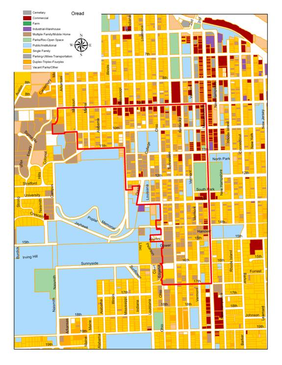 Oread Neighborhood: That area within the City of Lawrence, Douglas County, Kansas, which is bounded by Ninth Street on the north, Massachusetts Street on the east, Seventeenth Street on the south, Michigan Street on the northwest, the University of Kansas on the west to Gower Place, and the west boundary of the properties on the west side of Tennessee Street between 14th and 17th Streets.