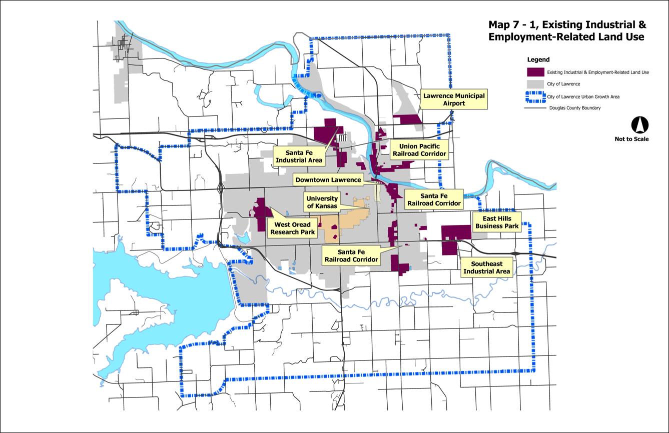 The City of Lawrence has several major industrial areas providing employment opportunities to the community.  These larger areas include: 1) Santa Fe Industrial Area; 2) East Hills Business Park; 3) Santa Fe Railroad corridor; 4) Union Pacific Railroad corridor; 5) Lawrence Municipal Airport; and 6) Southeast Industrial Area.  A description and plan recommendations for these areas are discussed below.  In addition to these primary industrial areas, the City of Lawrence also has a number of smaller industrial locations throughout the city.  While not specifically addressed in this section, these smaller industrial areas play an important role in the overall industrial and business development composition of the community as a whole.  Refer to Figure 7-1, Map of Existing Industrial and Employment-Related Land Uses.