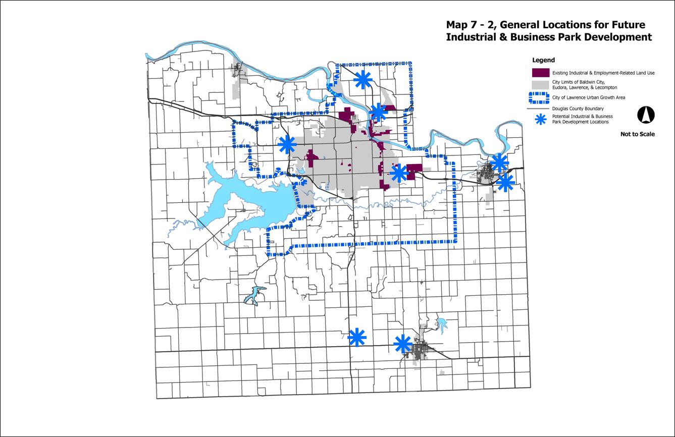 New industrial uses requiring municipal level of services in unincorporated Douglas County are not recommended unless they are designated as future development sites within the urban growth area for the City of Lawrence or in defined planning areas for the Cities of Baldwin City, Eudora, and Lecompton, and are annexed prior to development.  New industrial uses that do not require an urban level of service such as water or wastewater treatment may be permitted in appropriately designated areas of unincorporated Douglas County.