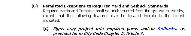 Add an exception allowing signs to be located in required yards and setbacks (Initiated: December 2006 with TA-12-14-06)
