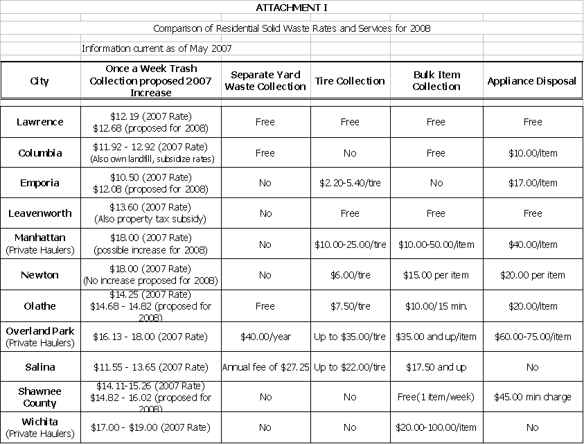 a. Residential rate of $12.68 per month which is an increase of $0.49 per month (present rate is $12.19 per month). A comparison of Lawrence's proposed rate and that of other cities is contained in Attachment I.
