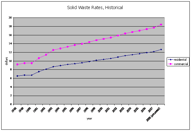 § Support for city operations: The Solid Waste division transfers funds to other city operating funds each year – general fund, work comp reserve, and health care fund. Some of those transfers were increased in the last two years after the rate study was completed. Thus the rates charged did not adequately plan for those additional transfers, particularly for work comp reserve and health care. In addition, we purchased a small rear loader for Parks and Recreation in 2006, which had not been planned or included in the rate calculations. Parks and Recreation collects trash from parks and some public spaces. In 2008, we need to “make up” for underestimating the revenues needed in prior years.
