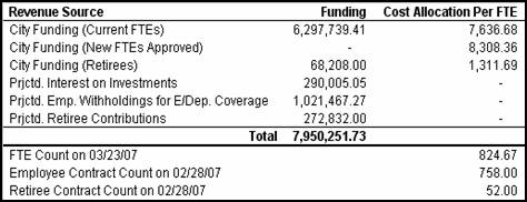 The level of funding recommended for the health plan during the 2008 benefit period is $7,950,251. We recommend annual City funding increase 6% ($360,336) over the 2007 level of funding or $6,365,947.41 in total. Each department should budget $7,636.68 per full-time equivalent (FTE) and $8,308.36 per new FTE approved for 2008 (increases over 2007 funding of $425.68 and $474.36, respectively). City funding per retiree contract should be $1,311.69 (a $27.31 decrease under 2007 funding) or $68,208 in total based on a 52 contract count.
