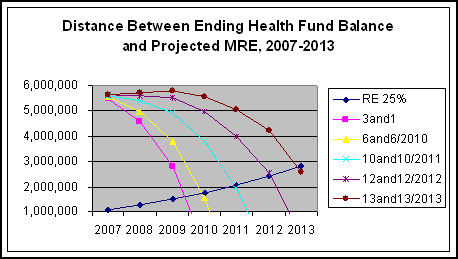Although MRE could be reached as early as 2010, and despite the fact that 58 new contracts were added in 2007, we are in favor of recommending the 6and6/2010 funding strategy for the 2008 benefit period. This is partially due to conservative assumptions in the risk analysis. Also, during meetings this summer, the Health Care Committee will strongly consider increasing 2008 out-of-pockets costs for both the major medical and prescription drug programs to place us more in alignment with the majority of like contracts held by BCBSKS and MedTrak Pharmacy Services. The last increase to out-of-pocket costs occurred January 1, 2002. Finally, BCBSKS presented our 2008 contract renewal on March 19, 2007 at an estimated annual 1.1% increase in total plan costs. MedTrak projected a preliminary annual 10% increase in prescription drug claims. Preliminary estimates of premium equivalent increases are currently 1.6%.