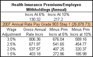 In 2007, annual employee withholdings for dependent coverage per contract total $2,172.00. With the recommended 6% increase, annual withholdings in 2008 would be $2,302.32. On a per pay period basis, the withholding would increase $5.01 from $83.50 to $88.51. Calculations projecting the net effect of this increase on various wage adjustments (without taking into consideration the pre-tax benefits of the withholdings) for employees in pay grade 903 and at step 1 are described in the table below. All scenarios resulted in an increase to net earnings.