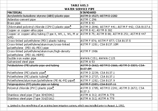 5-505 Table 605.4 of the International Plumbing Code is hereby amended to read as follows: