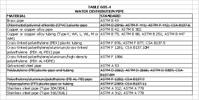 5-505 Table 605.4 of the International Plumbing Code is hereby amended to read as follows: