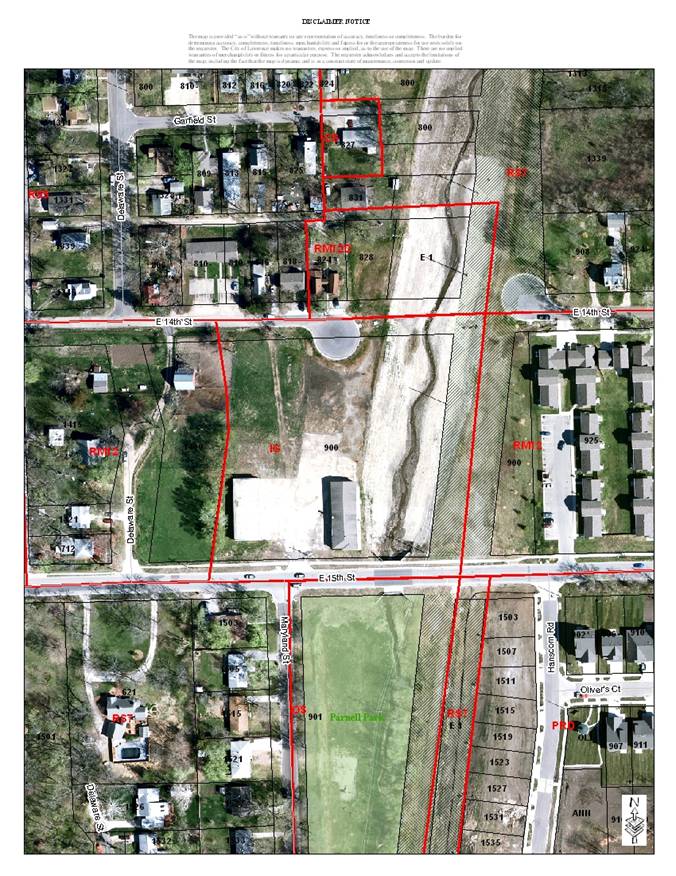 The subject property is located between E. 14th and E. 15th Streets on the north and south and Delaware Street and the abandoned railroad right-of-way (undeveloped Burroughs Creek Corridor Park and Trail) on the west and east.