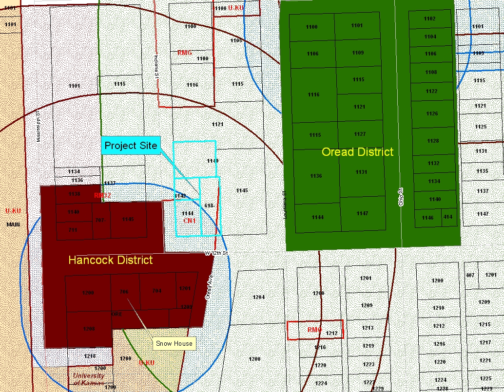 • The property is located in the environs of the Hancock Historic District, National Register of Historic Places and the Oread Historic District, Register of Historic Kansas Places.  The property is also within the environs of the Jane A. Snow Residence (706 W 12th Street), National Register of Historic Places and Lawrence Register of Historic Places.