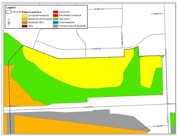 The property at the northwest corner of E. 31st and Louisiana Streets (Snodgrass property) is separated into two areas by floodplain and floodway. The total acreage that is not located within the floodplain is approximately 20.55 acres. This property currently has no platted lots or streets so possible density is calculated based on gross square feet. The gross density is the maximum number and does not take into consideration the requirements of the Land Development Code regarding street right-of-way, building setbacks, parking requirements, etc. The highest density in the range for the low-density residential land use category is 6 dwelling units per acre which would allow for a maximum of approximately 123 total units (using gross acreage). The highest density in the range for the medium-density residential land use category is 15 dwelling units per acre which would allow for a maximum of approximately 308 total units (using gross acreage). The density was also calculated for the RM12D District which is considered low-medium density residential. This would allow for a maximum of approximately 149 total units (using gross acreage).