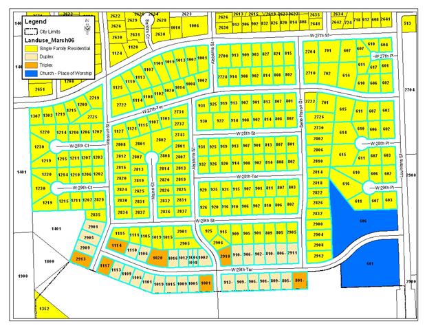 The single item that the three commissions did not agree on is the land use classification of the property at the northwest corner of Louisiana and E. 31st Street (Snodgrass property). Staff has completed additional analysis of the property in question as well as the nearby development pattern in the adjacent neighborhood. The area of the neighborhood that was analyzed is the area bounded on the north by W. 27th Street, on the west by Naismith Valley Park, on the east by Louisiana Street, and on the south by the Snodgrass property.