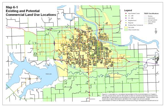 The Comprehensive Plan includes recommendations for the location of new commercial development. As the community grows, it may be necessary to change the recommended location of a Commercial Center(s) or not use a designated intersection for a commercial uses. If there is a need to move the recommended location of a Commercial Center or downgrade the recommended size of a center, the Comprehensive Plan shall be amended. Through the amendment process, the proposed location and/or change in size of the Commercial Center will be reviewed based on the effects the change will have on infrastructure systems, the surrounding land uses, the neighborhood and the community-at-large.