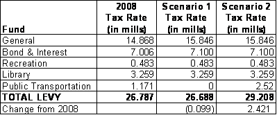 Scenario 2: Includes the City Manager’s recommended budget as well as full property tax support for the transit program, resulting in an increase to the mill levy of 2.52 mills. In 2009, $2,452,484 is needed to fully fund transit. Expenditures also increase in order to meet state law fund balance requirements of five percent (5%). The total mill levy in this scenario is 29.208. Tax bills for 2009 would include the increased levy.