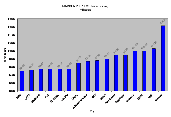 Mileage for the ambulance service providers surveyed ranged from $5.00 per mile to $16.25 per mile (see chart on page 4). The adjusted average (discounting the outlier of $16.25) is $7.38 per mile. LDCFM currently charges $5.50 per mile, which is 74.5% of the average. In 2006, we transported for 38,884 miles at a charge of $213,862. In 2007, we transported for 38,233 at a charge of $210,281.50. Raising the mileage rates to the average would result in a $71,878 increase.