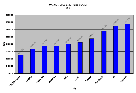 BLS rates for the ambulance service providers surveyed ranged from $250 to $675 (see chart on page 4). The average rate is $475.80. LDCFM breaks its BLS into emergency and non-emergency. Emergency BLS is charged at $375 (78.8% of average) while non-emergency BLS is charged at $250 (52.5% of average). There were 1,310 emergency BLS charges (76% of the total BLS charges) resulting in $491,250 and 417 non-emergency BLS resulting in $104,250 in 2006. In 2007, there were 1,354 emergency BLS charges resulting in $507,750 and 405 non-emergency BLS charges resulting in $101,250. Increasing both rates to the average would result in a $227,932 increase.