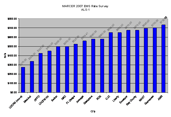 ALS-1 rates for the ambulance service providers surveyed ranged from $338 to $732.53 (see chart on page 5). The average is $559.41. LDCFM breaks its ALS-1 into emergency and non-emergency. Emergency ALS-1 is charged at $450 (80.4% of average) while non-emergency ALS-1 is charged at $275 (49.2% of average). There were 2,702 emergency ALS-1 charges (96.5% of the total ALS-1 charges) resulting in $1,215,900 and 98 non-emergency ALS-1 charges resulting in $26,950 in 2006. In 2007, there were 2,803 emergency ALS-a charges resulting in $1,261,350 and 37 non-emergency ALS-1 charges resulting in $10,175. Increasing both rates to the average would result in a $317,199 increase.